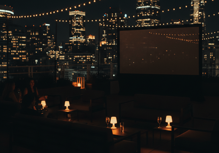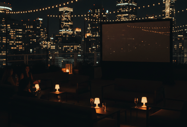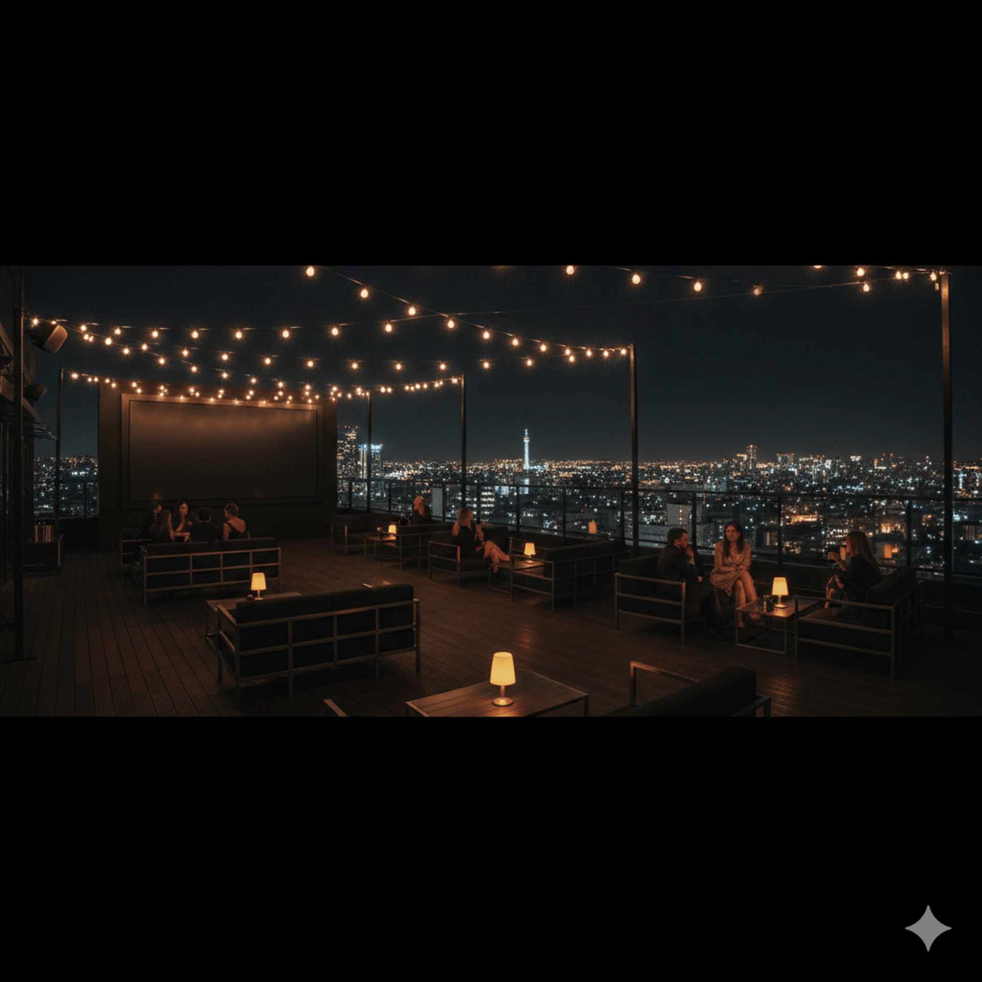 El skyline de la ciudad como telón de fondo. Diseñamos proyecciones exclusivas en las alturas, fusionando el networking corporativo con una atmósfera sofisticada e inolvidable.